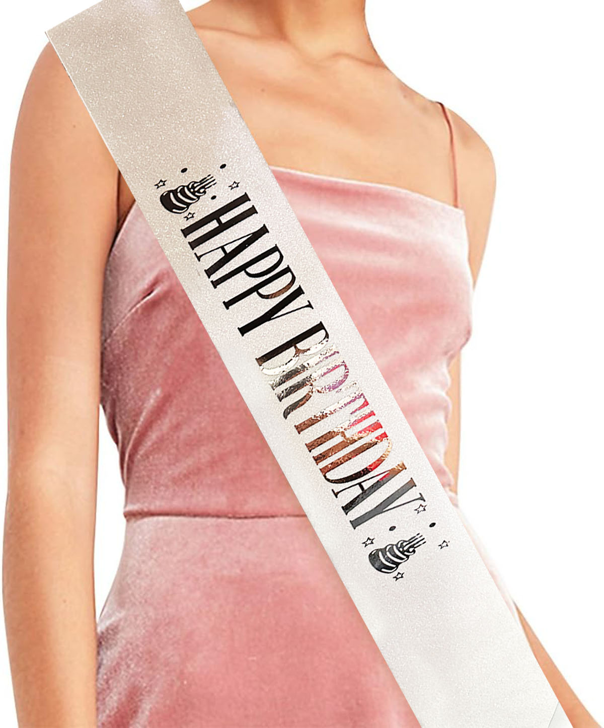 Beyaz Gümüş Happy Birthday Yazılı Simli Kuşak